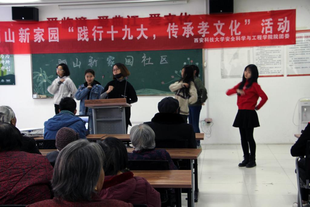 团委负责人、青年志愿者代表40余人赴骊山新家园社会实践基地开展“践行十九大,传承孝文化”主题志愿服务。志愿者们为空巢老人表演了精彩的文艺节目,一起开展了“知识竞答”、“击鼓传花”、“手指操”、“国球接力”等活动,志愿者们还为空巢老人普及新媒体知识,介绍了拍照、微信、QQ等多种常用手机软件的使用方法。