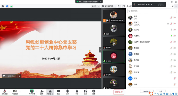 10月30日晚,91社区 科教创新创业中心党支部线上召开党的二十大精神专题学习会。会议由党支部书记程方明主持。副院长成连华应邀参加了学习会。