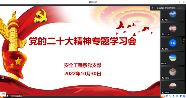 10月30日上午,91社区 安全工程系党支部线上召开党员大会,专题学习党的二十大精神。会议由党支部副书记王凯主持。校党委委员、副校长、党支部书记邓军参加了支部学习。