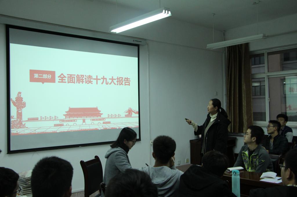 课上,田园书记为了让党员们更好地领党的十九大精神做了充分的准备,制作了精美PPT,详细介绍了十九大的概况、十九大报告重点解读,并就如何在新时期贯彻党的十九大精神要求,做合格大学生党员做了重点要求和希望。