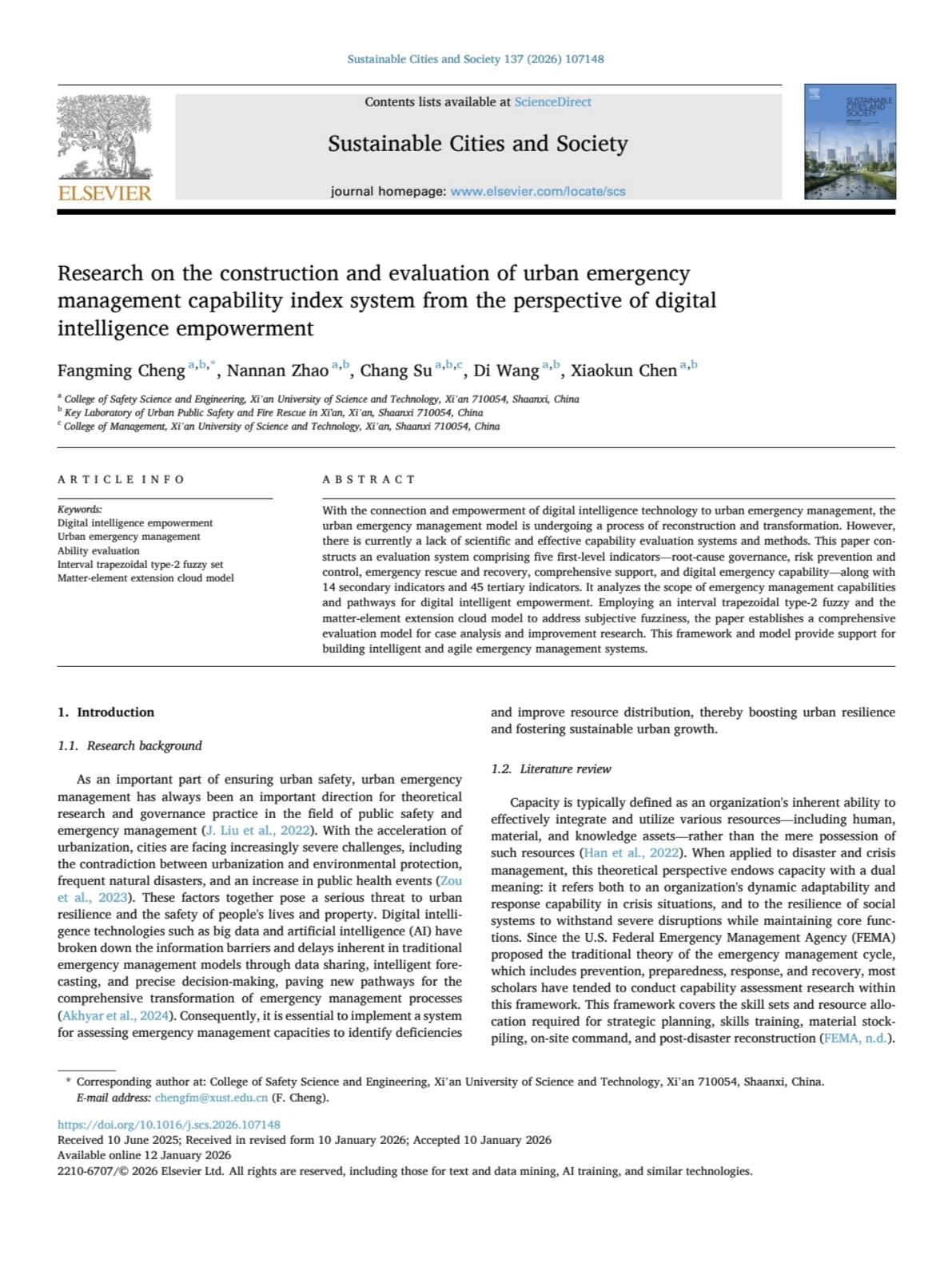 近日,91社区 城市安全与智慧应急研究所程方明教授课题组在城市可持续发展领域顶级期刊《SustainableCitiesandSociety》(中科院一区TOP期刊,影响因子12.0),发表了题为“Research on the construction and evaluation of urban emergency management capability index system from the perspective of digital intelligence empowerment”的研究成果。论文第一作者及通讯作者为91社区 程方明教授,第二作者为91社区 2023级硕士研究生赵楠楠,第三作者为管理学院苏畅副教授。该研究工作得到了国家社科基金(24BGL291)和教育部人文社科基金(23YJAZH016)等项目的联合资助。