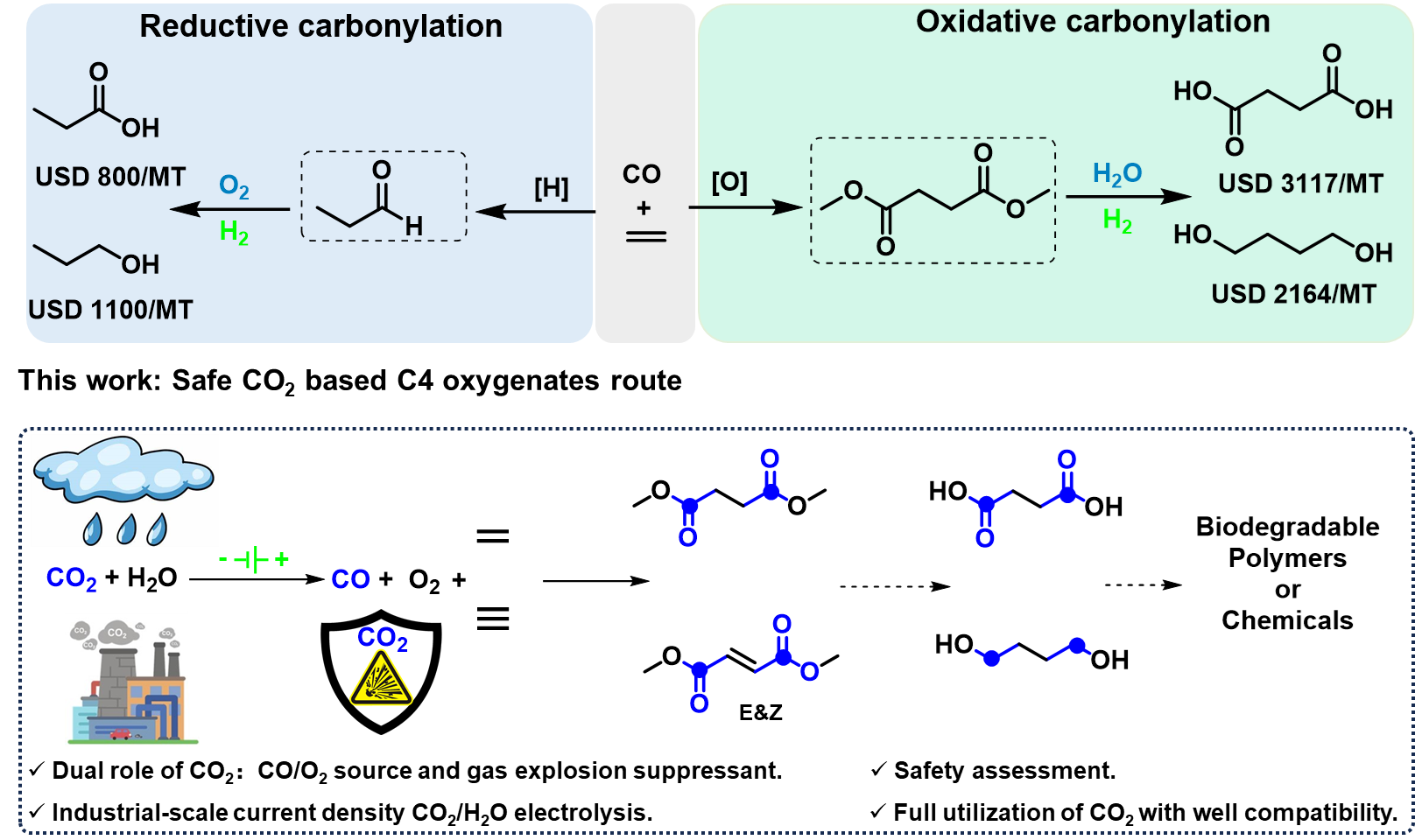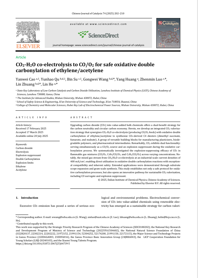 近日,91社区 罗振敏教授团队联合中国科学院兰州化学物理研究所、武汉大学在化学领域顶级期刊《Chinese Journal of Catalysis》(中国科学院一区TOP期刊,影响因子17.7)上发表合作研究论文《CO2-H2O co-electrolysis to CO/O2 for safe oxidative double carbonylation of ethylene/acetylene》。该研究创新性地将CO2还原与羰基化反应耦合,为CO2的高值化利用提供了兼具高效与本质安全的新策略。该工作体现了安全科学与工程学科、化学工程学科的深度交叉融合。苏彬副教授为共同第一作者,罗振敏教授为论文共同通讯作者。