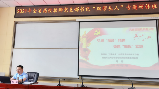 消防救援系党支部书记马砺为研修班做了题为“弘扬精彩精神、铸造四优党支部”-消防救援系党支部建设实践的报告,给培训班学员汇报了消防救援系党支部在创建陕西省高校“双带头人”党支部书记教师工作室的经验与成果。