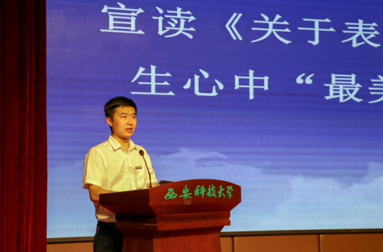 副院长成连华宣读了《2021届优秀毕业生名单》,行政副院长曹鸿宣读了《关于表彰2021年本科毕业生心中“最美教师”的决定》,学院党委书记杜勇、副院长林海飞分别为最美教师、优秀本科毕业生颁奖,学生代表向最美教师献花表示感谢。