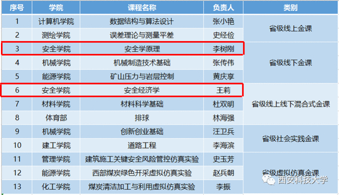 副校长李树刚教授负责的《安全学原理》课程获批陕西省线下一流本科课程,由安全系主任、双带头人党支部副书记王莉副教授负责的《安全经济学》课程获批陕西省线上线下混合式一流本科课程。