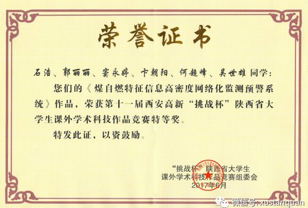 经过激烈角逐,我院王伟峰、邓军老师指导,石浩、郭丽丽等6名同学完成的《煤自燃特征信息高密度网络化监测预警系统》荣获特等奖;