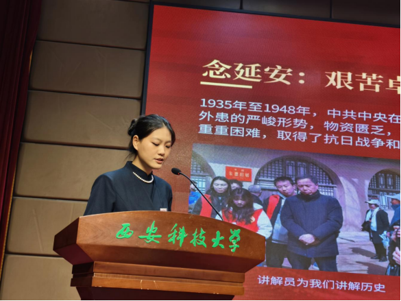 宣讲会在庄严的氛围中拉开序幕。7组赴延安参加研学的师生代表依次上台,分享他们的所见所闻、所思所悟。教师代表林伟、宋爽在宣讲中,阐述了将红色基因融入学生管理、教育教学的思考;学生代表朱信橙、林千渝、李思彤、罗乐、孔瀚民等同学,分别围绕“追寻红色足迹,汲取奋进力量”、“传承延安精神,忆苦思甜”、“到延安去,感受延安精神”、“圣地研学悟初心,传承精神勇担当”、“延安行红色心强国志”等主题,生动讲述了在革命圣地的感悟与成长。他们的汇报情感真挚,展现了新时代青年对延安精神的深刻理解和自觉传承。