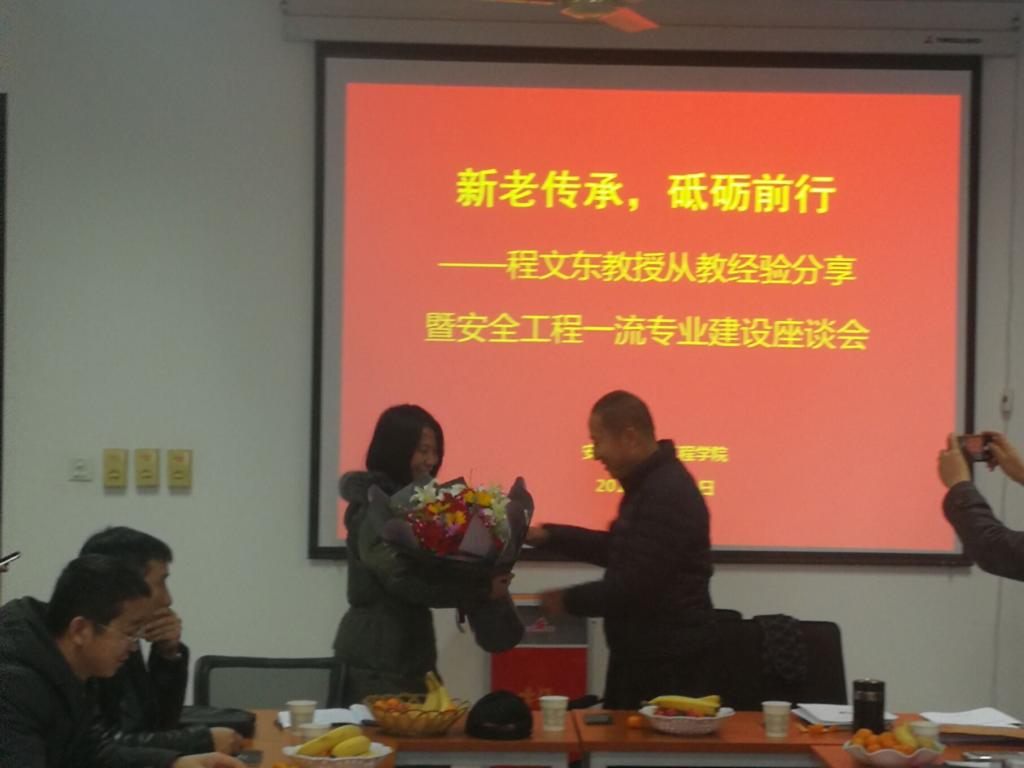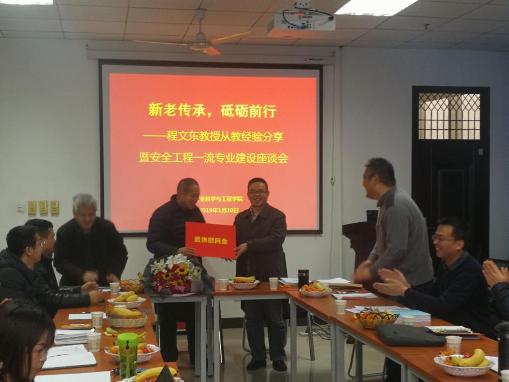 院长助理兼安全工程系主任成连华向各位新入职的教师介绍了程文东教授的基本情况。院长邓军号召学院教师以程教授为榜样,学习他认真、踏实的教学、科研精神。程文东教授深情款款的叙述了自己工作三十六年来的心得,道出了对工作、对同事、对学生的真挚感情、不舍之情,分享了对安全工程一流专业建设的深入思考,表达了对我院发展的美好祝愿。学生代表安全工程(卓越)1301班的武睿萌同学向程老师献花,表达了感激之情,并送上了自己的祝福。杜勇书记和邓军院长分别向程教授颁发了纪念品和退休慰问金。