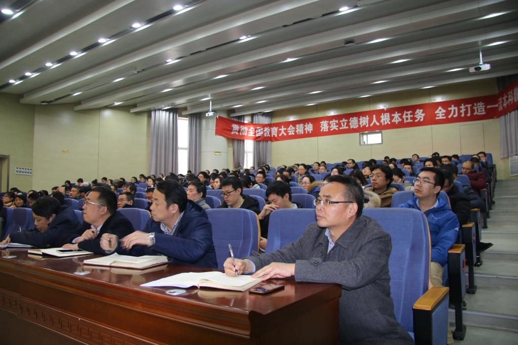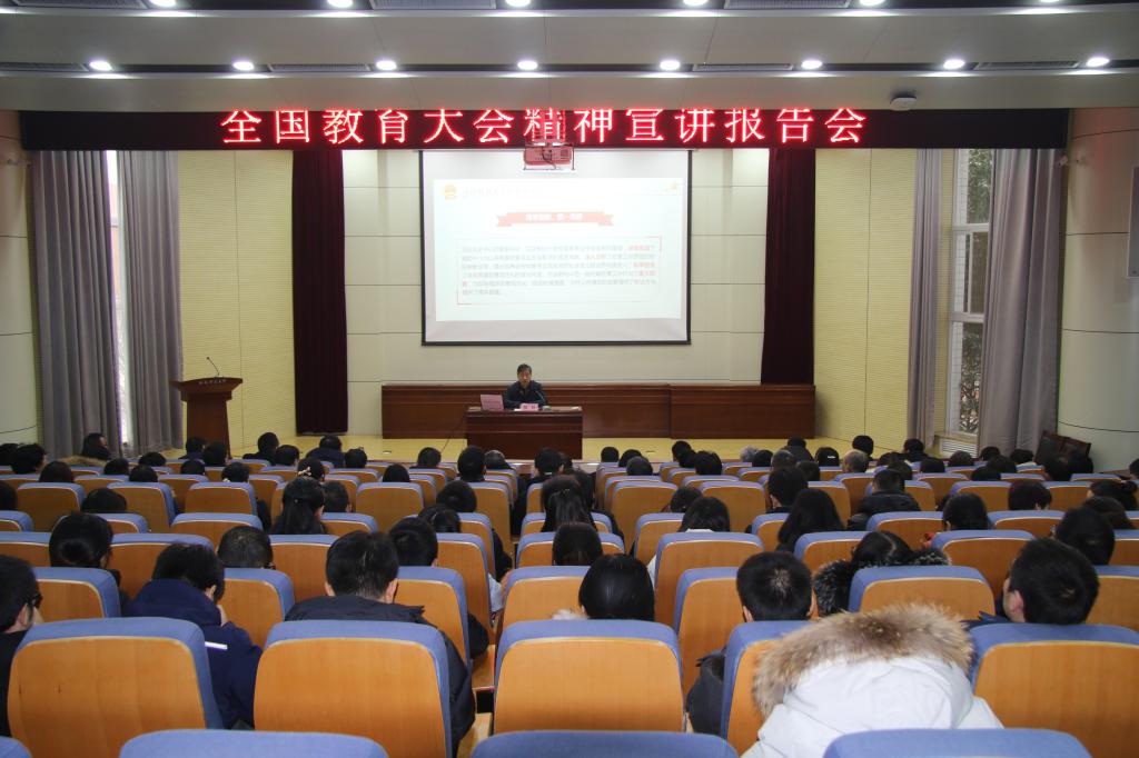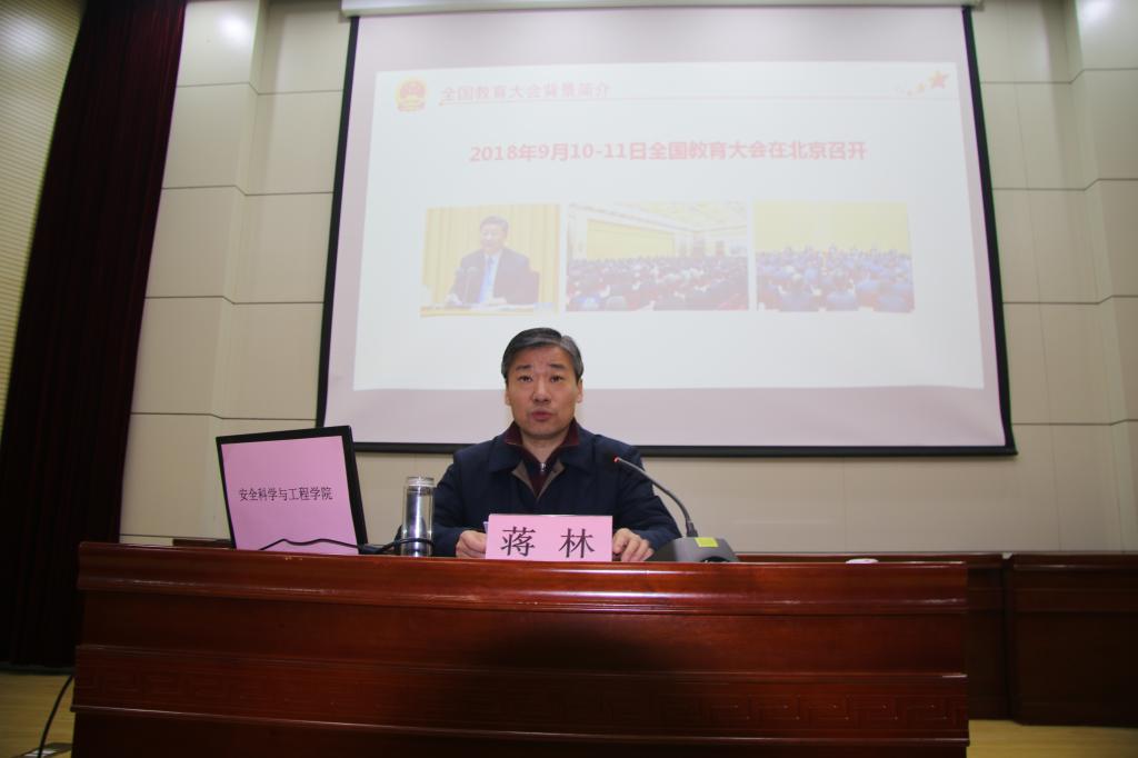 蒋林从深刻认识全国教育大会的背景与意义、全面领会习近平总书记关于教育工作的重要论述和认真落实全国教育大会精神,加强教师队伍建设三个方面就学习全国教育大会精神为广大教职工带来一场精神盛宴,对在各个岗位上为学校教育事业发展付出辛勤劳动的广大教师表示衷心感谢,同时向广大教师提出希望:希望广大教师深入学习和落实全国教育大会精神,牢记“教书育人”、“立德树人”的神圣使命,按照习近平总书记提出的“三个牢固树立”、“四个引路人”、“四个相统一”的要求,争做新时代“四有”好老师,发扬主人翁精神,秉承学校“励志图存,自强不息”的大学精神,深化91社区