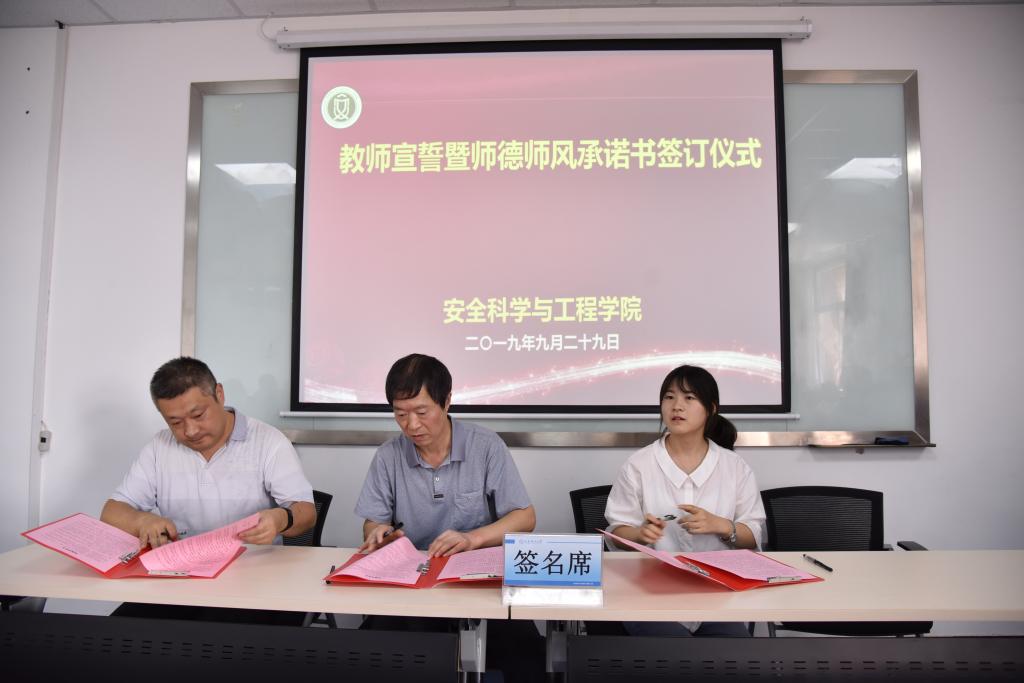 随后,学院举行了教师宣誓仪式,在领誓人张俭让教授的带领下,参会教师全体肃立、右手举拳,面对国旗,庄严宣誓。学院老中青教师代表张俭让教授、王建国副教授、芦星博士上台签订《师德师风承诺书》,代表了学院老中青三代教师优秀师德师风精神的传承。