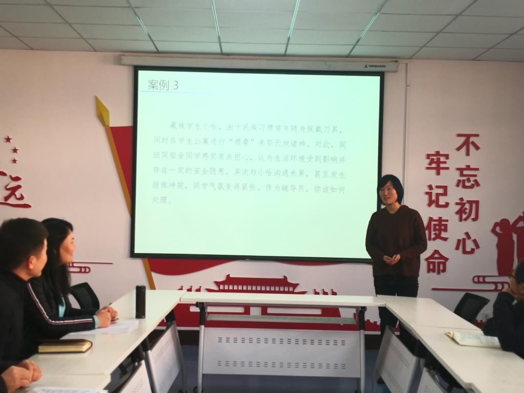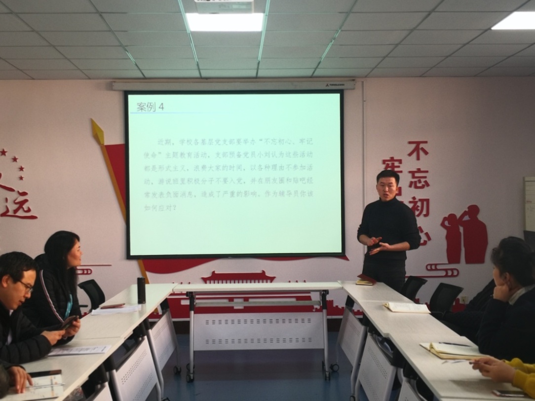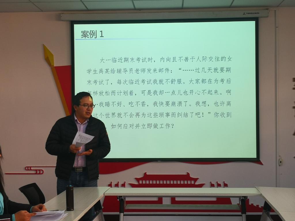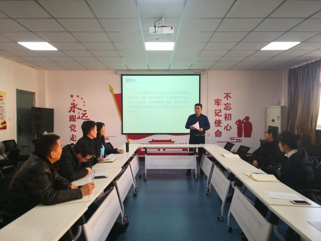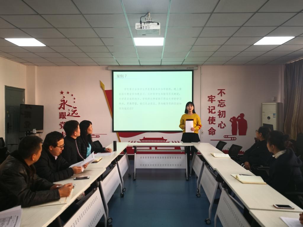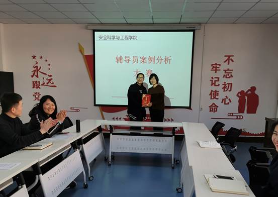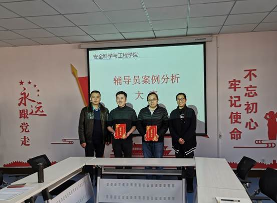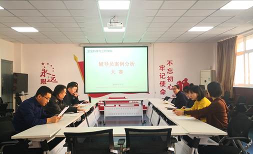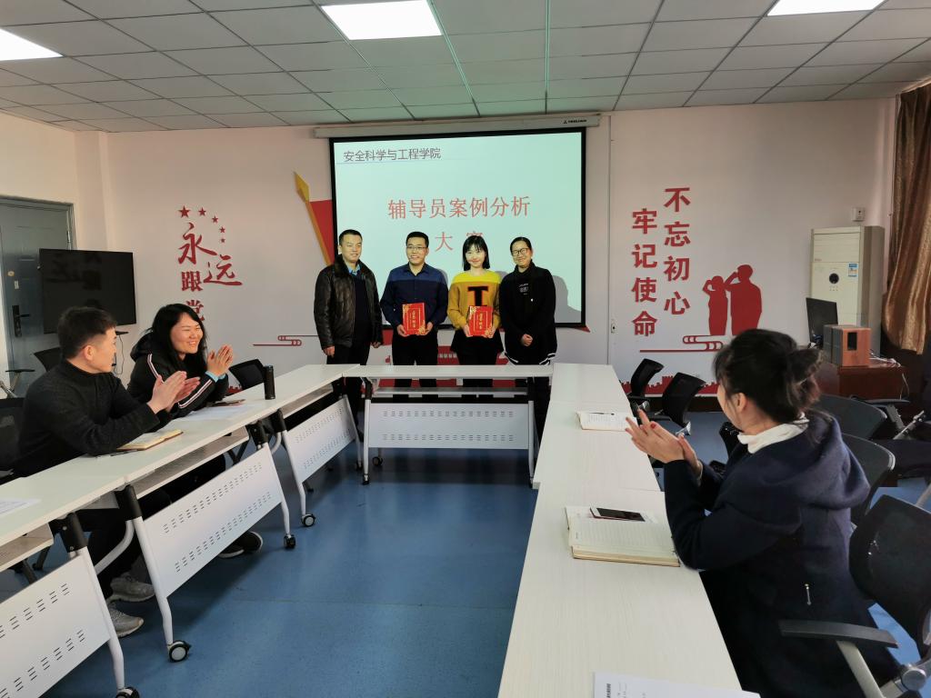 在14教320会议室举办辅导员案例分析大赛,学院党委副书记田园,院长助理、安全系主任成连华,双带头人党支部副书记、安全系副主任王莉,教务科研办主任李超担任评委,学院全体辅导员参加比赛。
