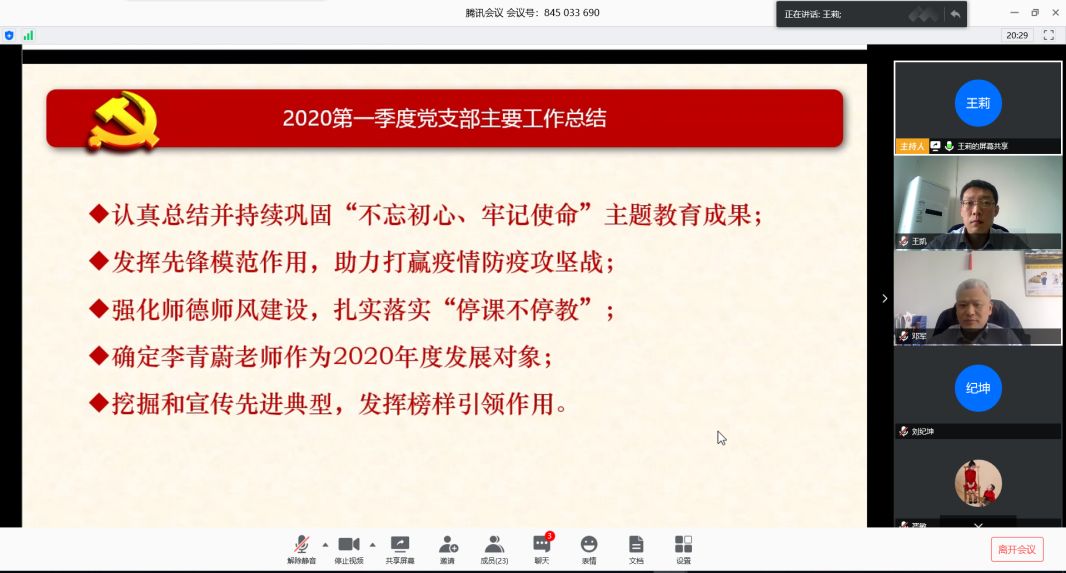 随后,王莉同志就支部2020年第一季度主要工作做出总结,并通报了支委会根据党内外群众意见和申请人条件,确定2020年度党员拟发展对象人选;对支部成员发挥先锋模范作用,助力打赢疫情防疫攻坚战的系列事迹做出表彰;梳理回顾了支部疫情期间在师德师风建设与落实、“停课不停教”方面的相关举措,通过在线教学经验分享与交流等教学活动,提升疫情防控期间线上教学质量,同时挖掘和宣传了支部先进典型,为全体支部成员发挥榜样作用做出表率。