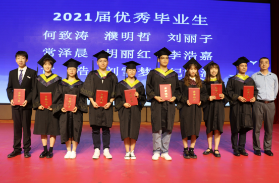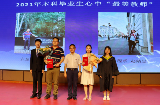 副院长成连华宣读了《2021届优秀毕业生名单》,行政副院长曹鸿宣读了《关于表彰2021年本科毕业生心中“最美教师”的决定》,学院党委书记杜勇、副院长林海飞分别为最美教师、优秀本科毕业生颁奖,学生代表向最美教师献花表示感谢。
