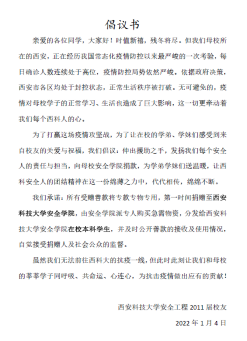 捐款,为学弟学妹们送温暖,让西科安全人的团结精神在这一份绵薄之力中,代代相传,绵绵不断”的倡议。在收到捐款17500元后,又考虑到学弟学妹们封控在宿舍的感受,精心策划采购了180份(4000余件零食)的“爱心零食大礼包”,委托在临潼校区学院疫情防控专班的领导和辅导员们代为分发,从而缓解同学们不能随意外出的心理焦虑。