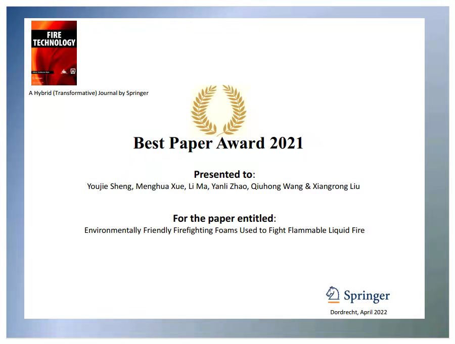 青年教师盛友杰的文章“Environmentally Friendly Firefighting Foams Used to Fight Flammable Liquid Fire”获得了该期刊2021年度最佳论文奖,华人作者发表的论文仅此一篇入选。