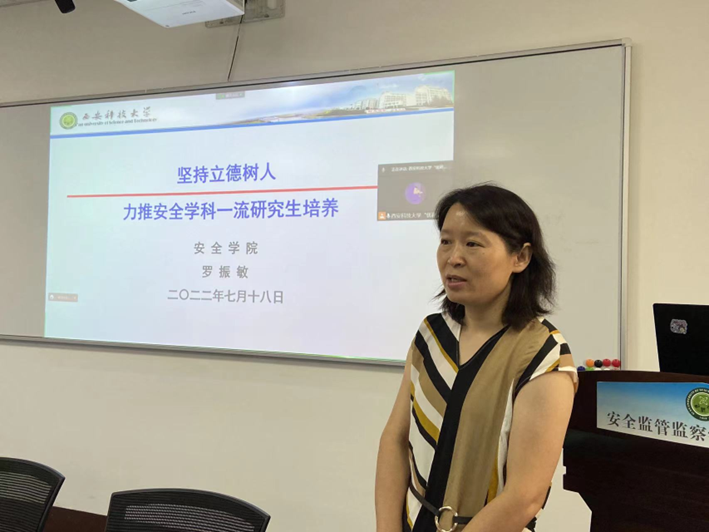 罗振敏作了《坚持立德树人,力推安全学科一流研究生培养》主题报告,详细介绍了学院的发展历程,展示了学院在学科建设、师资队伍、科学研究等方面所取得的骄人成绩,讲解了学院研究生培养的教育教学理念和定位、特色做法与成效等。