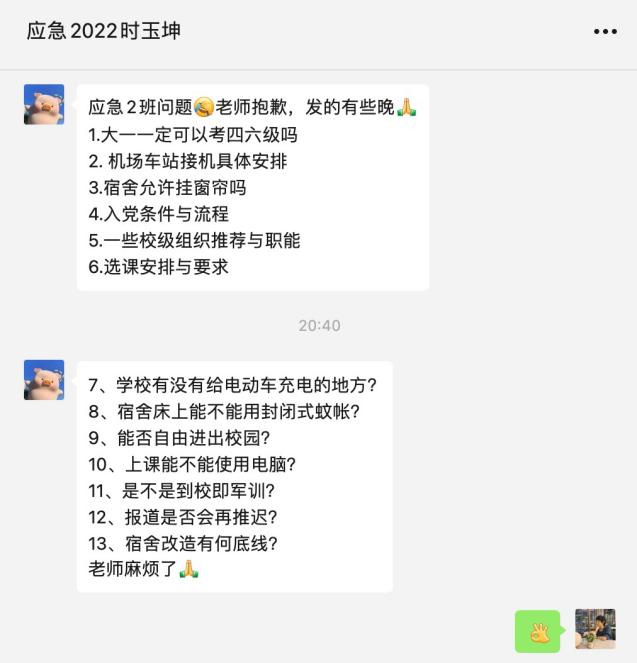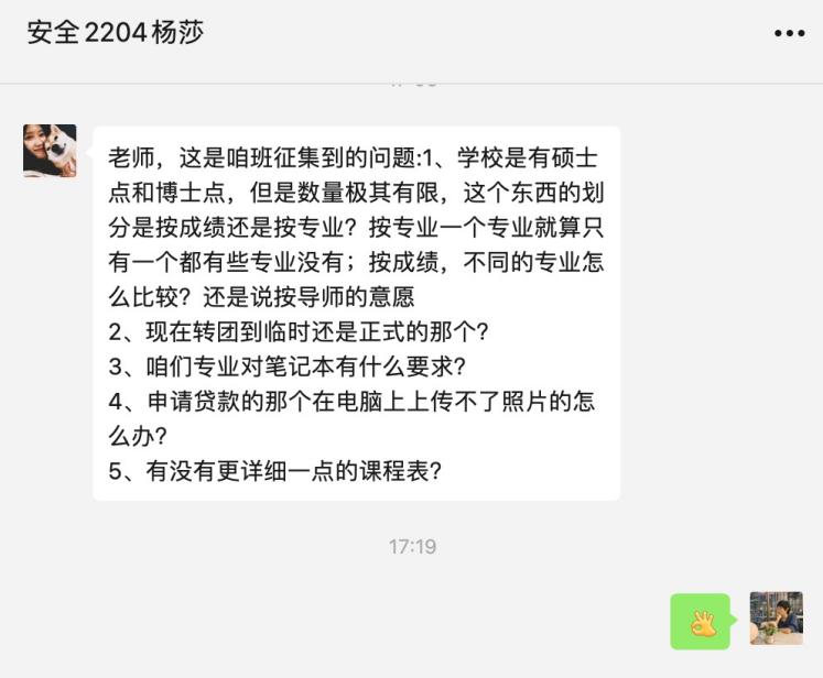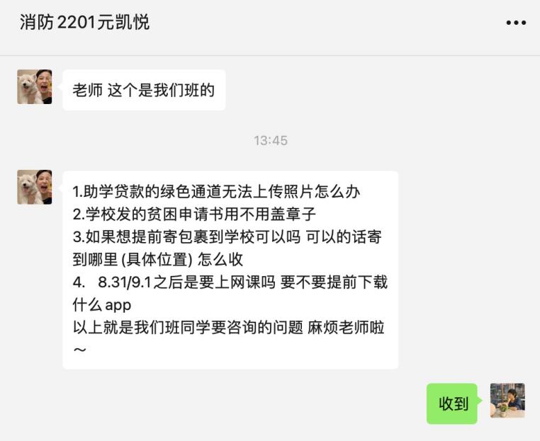 会上,王倩就学校调整开学时间的通知进行了强调,对疫情防控形势、入学报到手续等方面进行了说明,并就会前征集的同学们普遍关心的团组织关系转接、档案邮寄、学费缴纳、资助政策、宿舍管理等方面的问题进行了逐一解答。