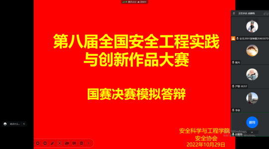 通过线上组织开展第八届全国高校安全科学与工程类专业大学生实践与创新作品大赛国赛模拟演练。安全工程系赵鹏翔、严敏、李俊、杨光等四位老师对入围国赛决赛的四件作品进行再打磨、再演练。