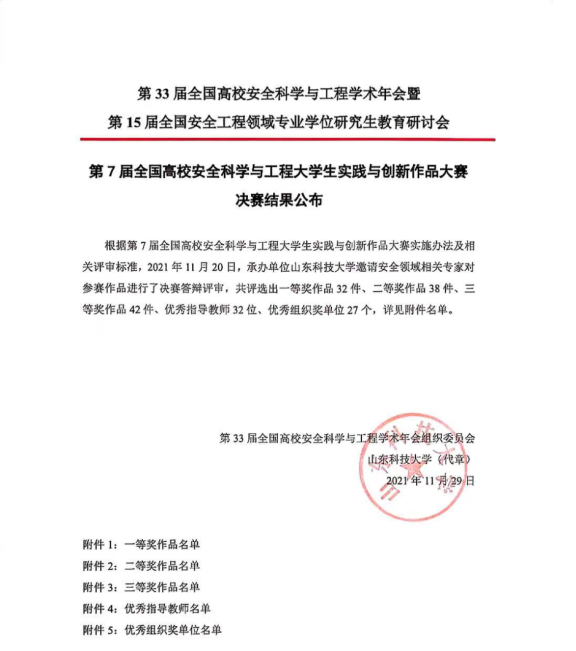 第33届全国高校安全科学与工程学术年会暨第8届全国高校安全科学与工程大学生实践与创新作品大赛共评选出全国一等奖37个、二等奖43个、三等奖59个。经过学校初选、组委会复审和现场评审,严敏副教授指导,张鑫洋、李文静、王思佳、范天乐同学完成的作品《采煤工作面瓦斯涌出态势智能预测系统》和李俊副教授指导,朱浩强、赵娜、宋婉嫣、刘雨晨同学完成的作品《基于GoogLeNet深度学习的长输油气管道安全诊断卫士》,以及杨光讲师指导,肖启鹏、朱恒、张亮 罗辉、徐立同学完成的作品《基于冷阴极气体放电的消防救援测漏电装置》等三件作品均获全国一等奖;赵鹏翔教授指导,鲁丹华、尚宇阳、李鑫、卢亚杰、权思雨同学完成的作品《瓦斯智能抽采调控平台》获全国二等奖;易欣教授指导,张擎驰、白鑫、曹萱芮、郝佳妮、张海旭同学完成的作品《矿用热舒适性防冲击服》获全国三等奖。严敏、李俊、杨光等3名老师被评为优秀指导教师,学校获优秀组织奖。