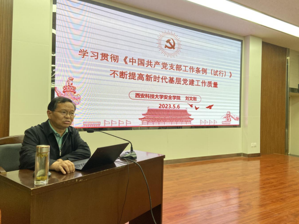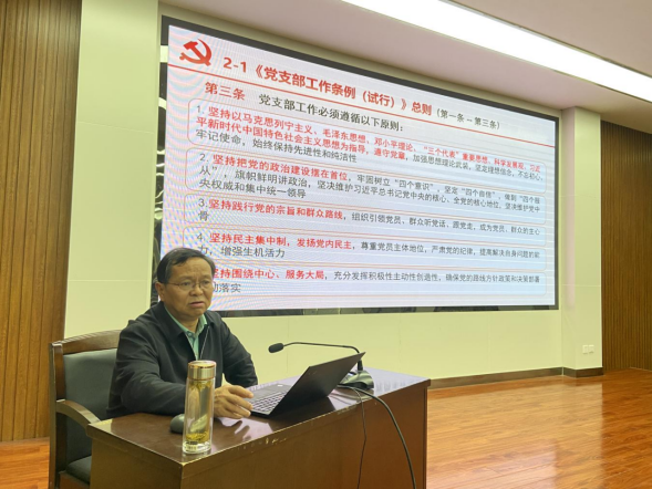 会上,学院党委书记刘文刚以“学习贯彻《中国共产党支部工作条例(试行)》,不断提高新时代基层党建工作质量”为题,从党的二十大报告中关于全面从严治党的重要部署入手,详细解读了《中国共产党支部工作条例(试行)》和《关于高校党组织“对标争先”建设计划的实施意见》,有针对性地提出了不断提高基层党建工作质量的路径,并就党支部开展学习贯彻习近平新时代中国特色社会主义思想主题教育进行再动员再部署。