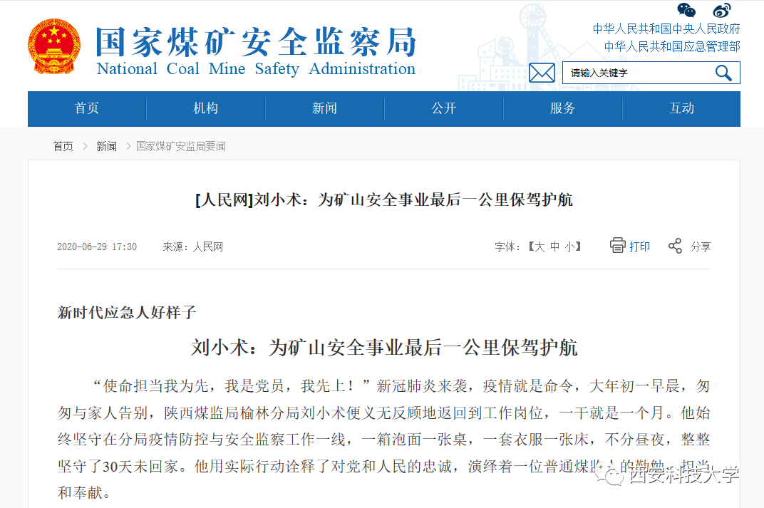 “使命担当我为先,我是党员,我先上!”新冠肺炎来袭,疫情就是命令,大年初一早晨,匆匆与家人告别,陕西煤监局榆林分局刘小术便义无反顾地返回到工作岗位,一干就是一个月。他始终坚守在分局疫情防控与安全监察工作一线,一箱泡面一张桌,一套衣服一张床,不分昼夜,整整坚守了30天未回家。他用实际行动诠释了对党和人民的忠诚,演绎着一位普通煤监人的勤勉、担当和奉献。